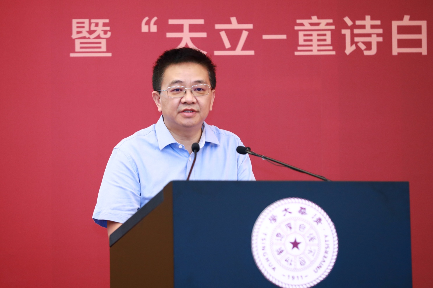 彭刚代表学校致辞。他高度评价了童诗白的学术成就和为社会作出的卓越贡献,指出童诗白先生以身作则,为教书育人、乐于奉献的宝贵精神做出了生动注解。值此隆重纪念童诗白先生百年诞辰之际,自动化系发起成立“童诗白教育发展基金”,并与神州天立教育集团携手设立“天立-童诗白中国自动化教育奖”,就是希望通过回顾童先生的事迹,继承和发扬童先生“乐教、奉献、钻研、团结、自律”的治学从教精神,激励师生向童先生学习,践行“价值塑造、能力培养、知识传授”三位一体的育人理念,投身一流大学的建设。彭刚谈到,童先生奉献毕生精力工作的自动化系已经走过了五十年,积淀了优良传统,取得了辉煌成就,是学校“双一流”建设的突击队,承担着率先迈入世界一流学科前列的重任。面向未来,如何培养更多热爱祖国、造福社会、引领发展的高素质创新人才,是自动化系必须肩负的时代责任。希望自动化系传承童先生的治学育人之道,把握创新内核,以国家需求为动力,切实推动新一轮学科创新蓝图付诸实施,将自动化育人成果推向新高度;希望自动化系传承发扬童先生的为师之道,培养造就出新时代潜心育人、矢志创新、德高身正、报国为民的高素质教师队伍。