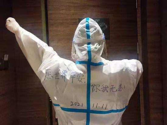 隔离不隔爱。很多人因不适应隔离生活产生了消极情绪,为缓解心理不适,队员们每天主动通过电话或见面沟通进行安抚,减缓烦躁与焦虑的情绪。对于情况严重的人员,队员们会采取个性化处理方式,积极帮助他们对接心理热线,确保得到专业的情绪排解通道。“有人因为要隔离而导致家中生病的妻子无人照顾,情绪几近崩溃。我们在给他抚慰的同时,还积极联络他所在的社区和志愿者,多方联动,帮助他妻子得到妥善照顾。”谢志毅说,“我们的队伍很年轻,但表现一点不含糊。”支援期间,队员崔苗苗在隔离点度过了24岁生日,这是她入职后过的第一个生日,当天她在防护服上写下“愿世界平安,你我无恙!”