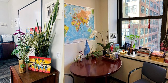 春节前的纽约异常寒冷,但是,当我们跨进联合国南南合作办公室的会议室里,还是感到了一派春天的气息。一位优雅的中年女性站在会议室欢迎我们,她一身唐装,笑容灿烂。当我们品评她衣着的“中国风”时,她把我们领到对面的个人办公室,指着里边的非洲版画、东欧的陶罐、南亚黑泥小马和水墨熊猫画说:“其实在联合国工作,我们身处和营造的,都是一个多元文化并存的环境”。