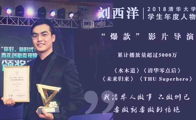 “我清华人做事,不做则已,要做就做到惊艳”。2018年,他接连导演创作出《水木道》《清华零点后》《未来归来》《THU Superhero》等“爆款”影片,累计播放量超过5000万,多次获央视、人民日报、环球时报等海内外媒体转发、报道。他的作品独具匠心,满怀清华精神与人文情怀,向世界展现了当代清华人青春、温暖的一面,在校内外均有极大影响力。