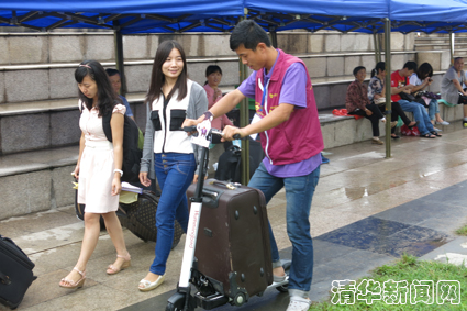 北京近日一直阴雨不断,为防止同学们的正常报道受雨水的影响,小研志愿者们在准备物资时还特别增添了雨具,并东门还特别设置了运行李的电动滑板,帮助新生托运行李;在圆明园地铁站与西门校园巴士站点之间安排了摆渡车。