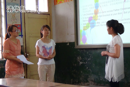 针对英语教师普遍非英语专业出身,语音、写作等基本功欠缺的情况,英语组的队员们增加了大量的音标练习与课堂对话,鼓励老师们积极参与。老师们一开始表现得腼腆,大都对队员的邀请报以沉默的微笑,经过队员的不断鼓励,老师们渐渐放下羞涩,与队员间产生了更多的互动。来自城关镇的吕丽华老师听课时认真不停地在笔记本上写写画画;练习语音时,勇敢自信,时而还在志愿者领读后自觉地比划口型纠正自己的发音;对话练习时,常邀请自己的同桌做搭档一同在全班老师面前展示。队员们纷纷被老师的学习热情所感染,更加认真地投入培训。