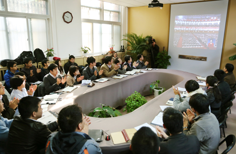 公管学院一层报告厅师生观看十八大直播现场。