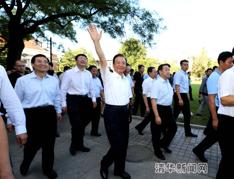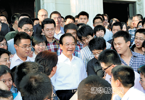 图为温家宝与清华师生挥手惜别。记者 智斐 摄