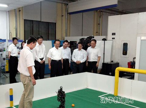 图为温家宝观看机器人踢足球表演。记者 郭海军 摄