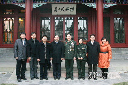 图为校党委书记胡和平(左四)、校党委副书记邓卫(右二)等与报告团一行合影留念。