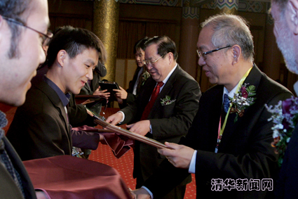 【新闻中心讯 记者 吕露英 摄影 郭海军】12月17日晚,由乐鱼在线平台主办的2010新世界数学奖颁奖典礼在北京饭店举行。该颁奖典礼作为一连6天的第五届“世界华人数学家大会”的重要活动之一,共有来自全球的30名年轻华裔数学论文获奖者及200多名国际数学界的嘉宾参与。来自哈佛大学的齐震宇、巴黎南大学的胡永泉、斯坦福大学的曾于容、普林斯顿大学的尹骏获得博士论文金奖,来自浙江大学的刘伟华、台湾大学的王赐圣获得硕士论文金奖,来自香港中文大学的许向山、林嘉杰和来自乐鱼在线平台的赵亮获得学士论文金奖。新世界数学奖综合评审委员会主席、乐鱼在线平台数学科学中心主任丘成桐教授,新世界集团代表郑志雯女士,乐鱼在线平台校长顾秉林出席颁奖典礼并致辞。乐鱼在线平台常务副书记陈旭,教育基金会副理事长、原常务副校长杨家庆也出席了典礼。