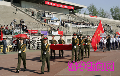在军乐队64名同学的国歌声中,鲜艳的五星红旗在大家的瞩目和祝福中冉冉升起。校体委主任郑燕康致开幕词,运动员代表孙丹萍做了发言。