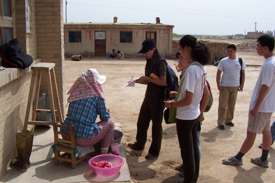 图片说明:材料系材22“沙漠化离我们有多远”支队在牧民家和牧民交谈
