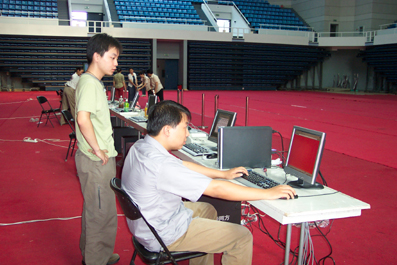 图片说明:工作人员正在调试数字化迎新系统