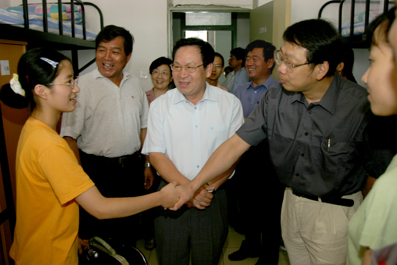 【新闻中心讯 记者 薛建团 摄影 郭海军】8月18日是我校2004级新生入学报到的日子。上午,校长顾秉林、党委书记陈希、常务副校长何建坤、党委副书记庄丽君、校务委员会副主任郑燕康等来到迎新工作的两个主要区域:综合体育馆和紫荆公寓区,检查工作,了解情况。