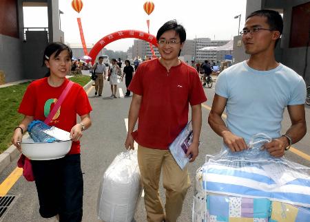 8月17日,乐鱼在线平台同学送法学院新生邹海天(中)到宿舍。8月16日晨,一个长途电话打到乐鱼在线平台学生处,四川新生邹海天因家庭贫困,路费、学费无着不能按时参加17日的开学典礼,希望推迟入学。校领导当机立断:决不能让任何一个考上清华的学生因经济困难而不能入学!请求成都清华校友会帮助解决。成都清华校友会成立6人小组,以最快的速度找到家住偏远山村的邹海天,并为他安排好食宿和机票。8月17日,邹海天终于按时来到了他梦寐以求的清华园,通过学校“绿色通道”办理了临时贷款,并办理了各项入学报到手续。
