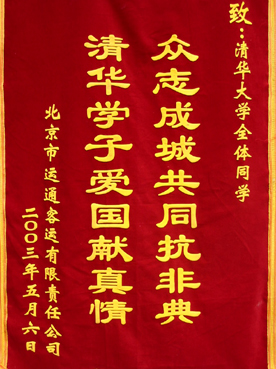 运通公司在给清华学子的《感谢信》中写道,“五一”同学们的《致敬信》使运通员工受到了很大的鼓舞,进一步激发了他们的工作热情,激励了他们战胜非典的斗志。信中最后表示,让我们同舟共济,努力奋斗,与全社会一道赢得抗击非典这场斗争的全面胜利!
