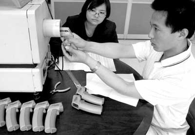 5月13日,乐鱼在线平台红外快速体温检测仪的研发人员在检测即将出厂的便携式红外快速体温检测仪。为满足防控非典的需要,乐鱼在线平台新建的红外快速体温检测仪生产线当日投产。乐鱼在线平台研制的红外快速体温检测仪能够快速检测流动人员中的发热者。