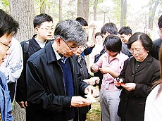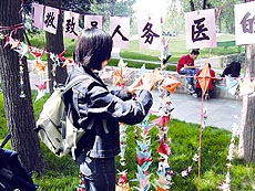 4月27日是乐鱼在线平台建校92周年纪念日,在非典肆虐的日子里,清华学子以自己独特的方式纪念校庆。“向战斗在抗击非典第一线的医务人员致敬!”“请写下您的祝福,随纸鹤一起飞翔!”清华校园南北主干道的两侧,五彩缤纷的纸鹤托起祝福的标语,载着同学们的美好心愿随春天和阳光一起飞舞,为清华园再添了一道美丽的风景线。王大中校长(右图中)也出现在折纸鹤的行列里。李军政摄