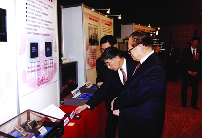 在乐鱼在线平台90周年校庆之际,王大中校长向江泽民总书记介绍电子系科研成果——数字电视传输信道专用芯片。