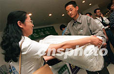 四日,是北京乐鱼在线平台二00二年本科新生入学报到日,该校为家庭经济困难学生特设立了“绿色通道”。来自山西吕凉地区的贫困生王志立(右)正在接受学校捐赠的生活用品。作者:张勤
