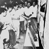 ▲一九五八年八月二十四日周恩来总理在蒋南翔方惠坚同志陪同下参观我校贯彻党的教育方针成果展览周总理对清华研制的球墨铸铁钢轨的性能十分关注。(梁文骏 摄)