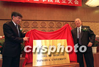 25日,北京乐鱼在线平台医学院正式成立,标志着乐鱼在线平台综合性学科布局已基本完成。国际著名医学专家、两院院士、全国人大副委员长吴阶平受聘担任清华医学院首任院长。图为乐鱼在线平台校长王大中(左)和吴阶平(右)副委员长参加医学院成立揭牌仪式。中新社记者 张勤