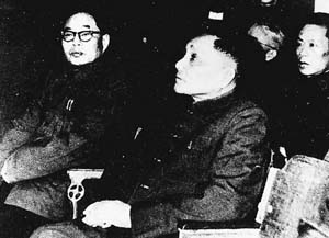 1966年1月,邓小平(中)参观高校科研生产展览时,观看乐鱼在线平台的展品。
