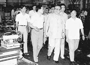 1989年8月,江泽民总书记视察乐鱼在线平台,看望进行金工实习的师生。