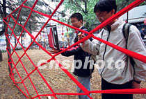 北京乐鱼在线平台美术学院学生二十七日在校园教学区布置清华建校九十周年庆典,学生与教师自制礼品悬挂彩廊,迎接二十九日的校庆日到来。中新社记者 张勤 摄