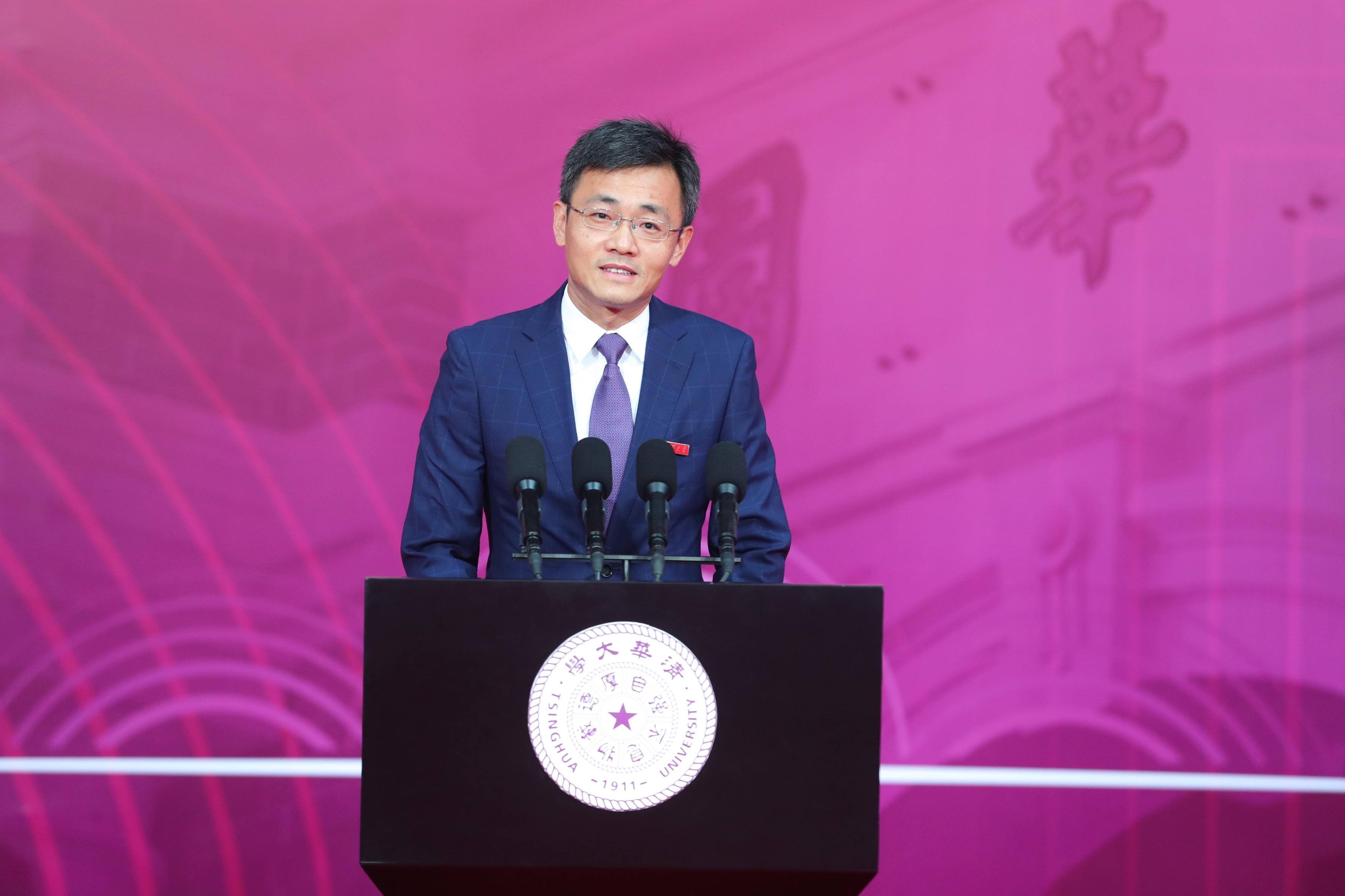 最后,请允许我回忆一下26年前我入学时最难忘的一个片段。那天我和你们一样兴高采烈地走进清华。奔向独立生活的愿望如此强烈,我迫不及待地就让我的父亲早早离开。收拾行李,认识同学,宿舍夜谈,度过了非常充实的一天。然而,第二天天刚亮,我和我的舍友们被一阵敲门声惊醒。开门一看,原来是我的父亲,他一手拿着一块捡来的砖头,一手拿着一枚钉子,跟我说:“你上铺的铺板有些松动,我昨晚一直在担心,我来帮你固定一下就走。”父亲钉完钉子就离开了,但他拿着砖头的背影直到今天我还记得。各位亲爱的学弟学妹,在今天典礼结束之后,请记得给爱你的家人打一个电话。他们是今天最高兴又最失落的人。在未来的几年中,也请你们常常的记得他们。他们虽然最盼望的是你们的成功,但是如果有一天,你们遇到了失败,他们是还会爱你,直到最后的人!
