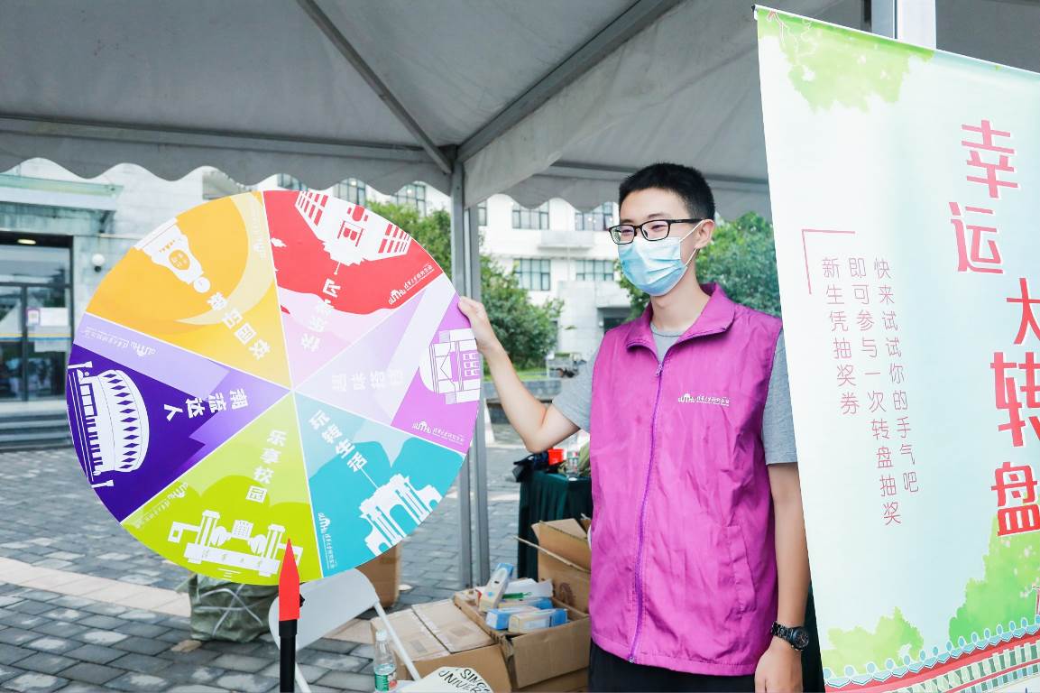 在学生服务中心(C楼)前广场的迎新集中点,学校研究生会为2021级新生们设置了独具匠心的主题展板互动区,帮助新生快速融入校园生活、了解清华文化。同学们可以在“百年接力,强国有我”“无体育,不清华”等主题展板前打卡留念,在“幸运大转盘”前游戏互动,在“致2049”的时光信笺里书写对未来的期盼。