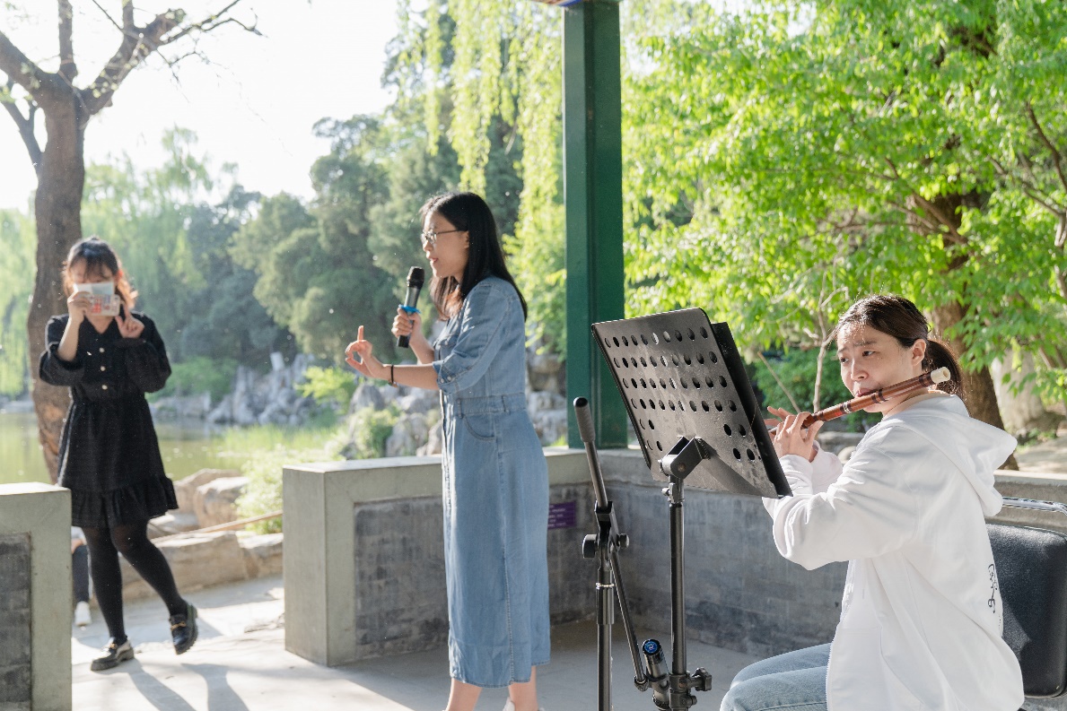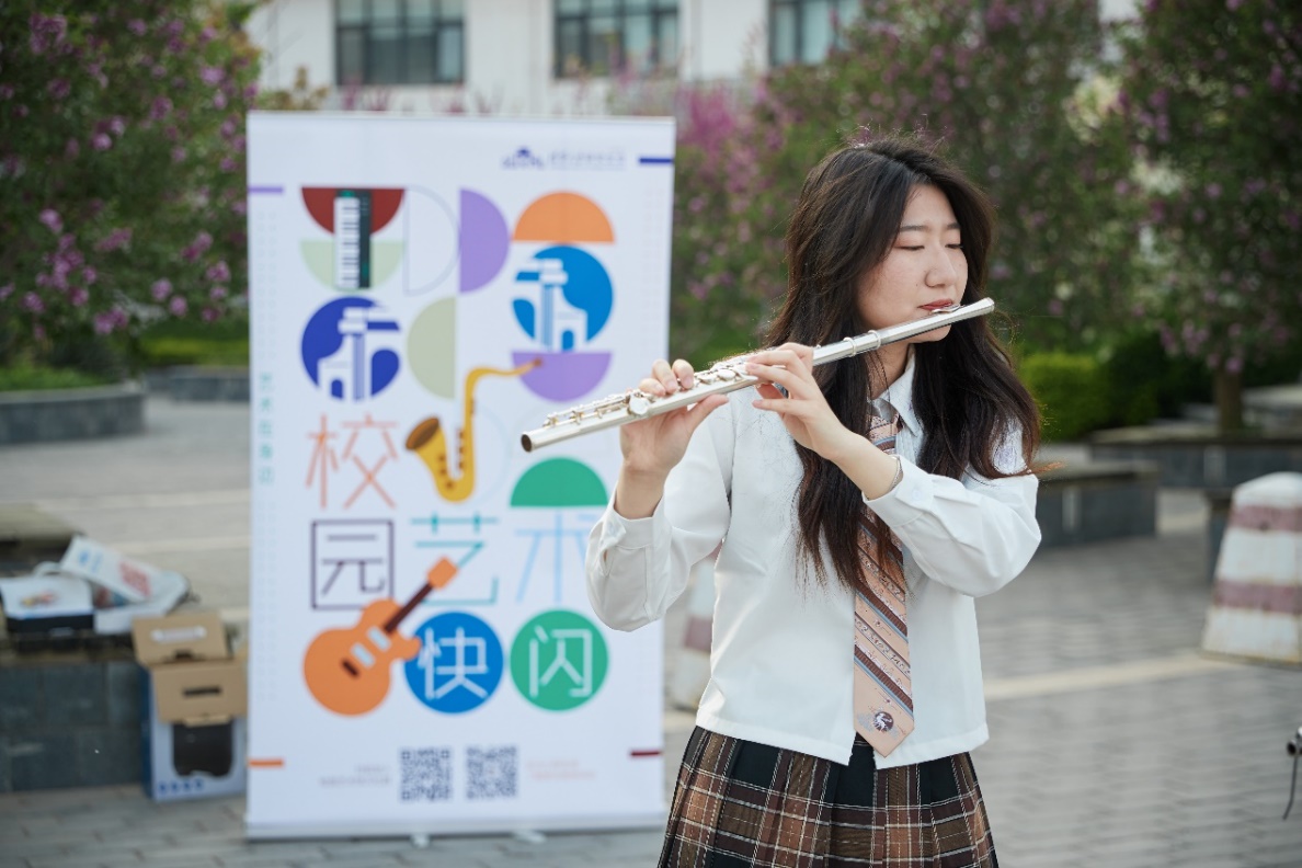 紫荆学生综合服务楼前的演奏快闪,笛声阵阵悠扬。