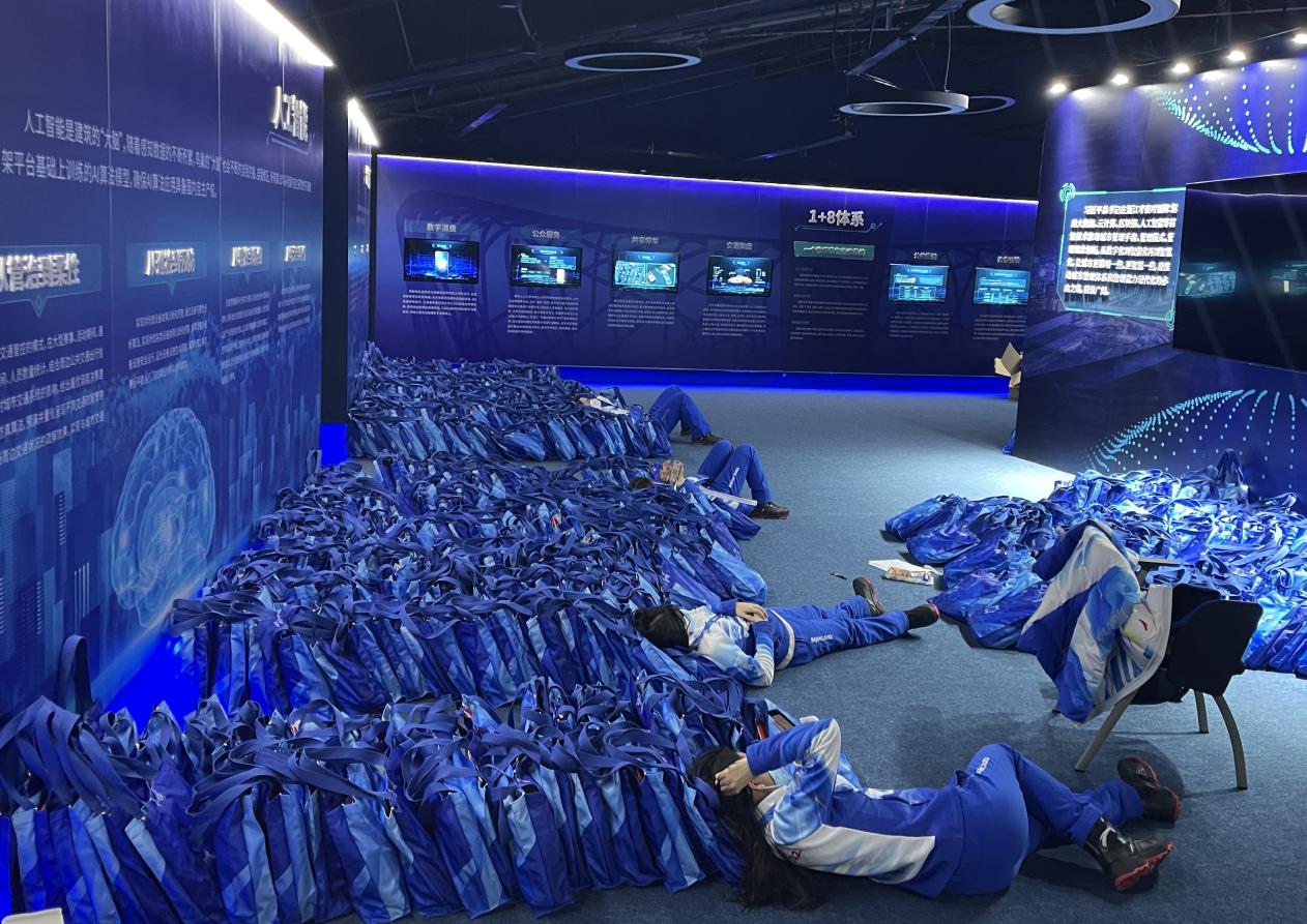 从清晨到深夜,从隆冬到新春,鸟巢逐渐成为志愿服务生活中的一部分,蔚蓝的科技讲堂也成了我们的常驻地,经常在里面找个角落,席地而睡。
