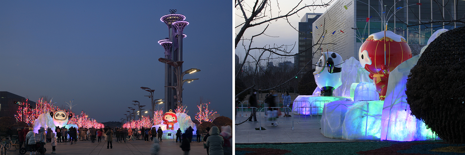 奥林匹克公园南端“冰雪之约”景观装置长29米、宽15米、高7.5米。基座以雪上运动基地为原型,冬奥会和冬残奥会吉祥物矗立其上。