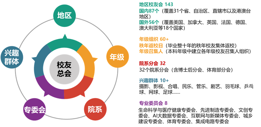 勇当地区校友工作“铺路石”,建章立制规范组织发展,守望相助凝聚清华力量。目前海内外校友会组织已达143个,其中国内87个、国外56个(覆盖18个国家)。校友总会与各地校友组织保持密切的联系,以建立地区校友会备案制度、邀请地区负责人参加工作会议、联合开展活动并协助宣传等方式,全力支持地区校友工作。新冠疫情之前,各地校友组织年均开展活动200场,参与人次超过2万。2020年初,新冠肺炎疫情暴发,校友总会迅速行动,对接全球各地校友组织开展捐款捐物、相互守望支援。据不完全统计,校友总会为15个国家的校友寄送口罩22万只,全球各地46个校友会、187家校友企业以及众多校友,为防疫捐赠物资超过140批次、捐款逾8.2亿元。防疫期间,校友总会积极指导各地以多种形式安全开展校友活动,各地校友组织年均开展150余场活动,万余人次参与。为加强境内校友交流和工作分享,校友总会每年联合地方校友会主办“乐鱼在线平台校友工作会议”,至今已举办23次,近五年会议分别在北京、南京、青岛、合肥、沈阳举办。此外,为凝聚北美、欧洲等海外重点地区校友,五年来校友总会指导召开3次北美校友大会、1次欧洲校友大会,引发海内外校友热烈反响。