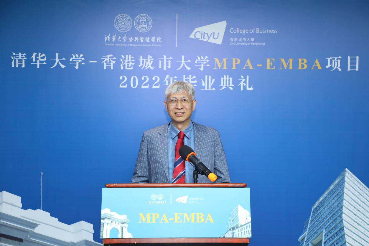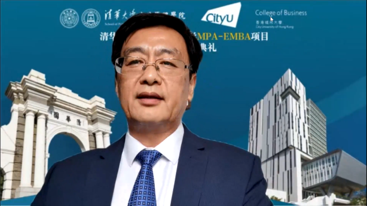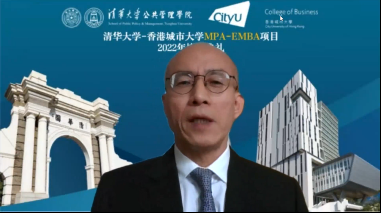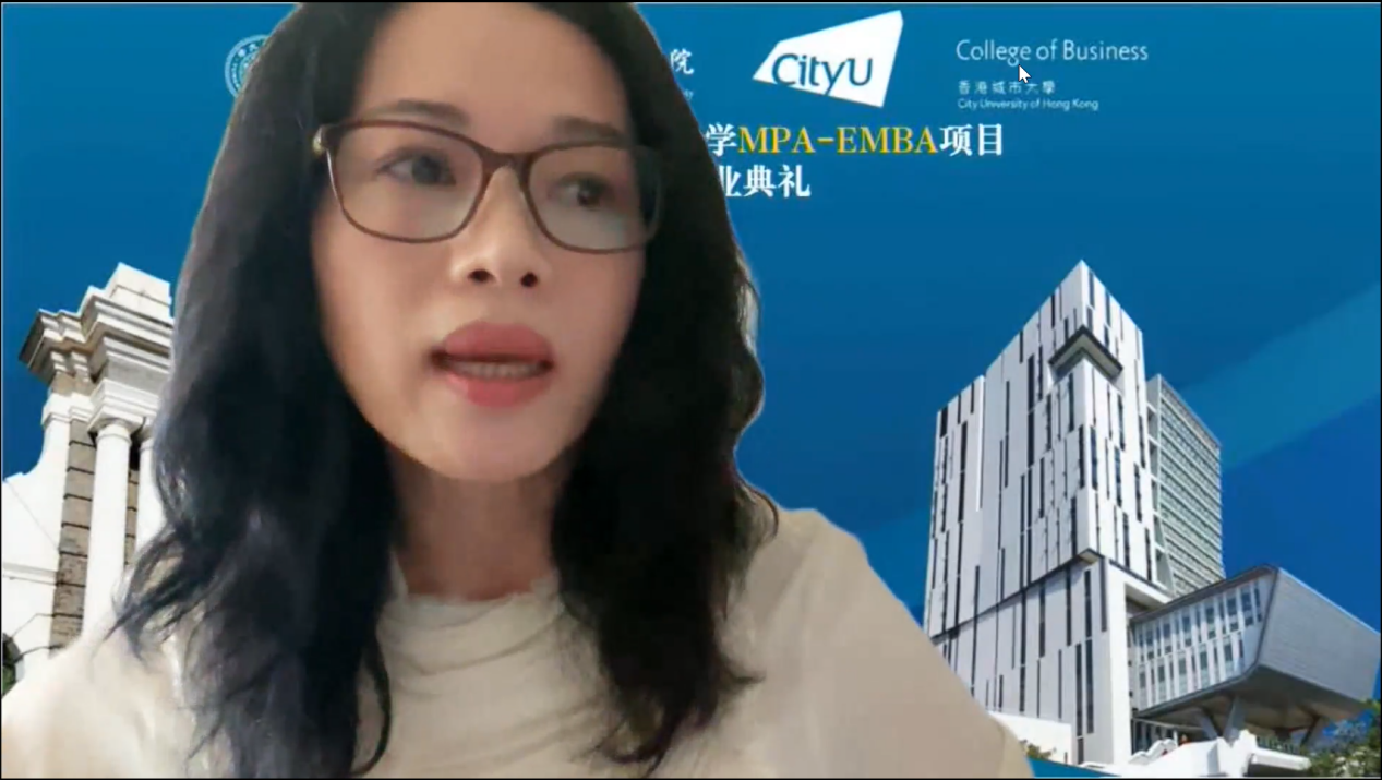 杨梦甦发表视频致辞。他首先向毕业同学表示祝贺,并表示项目同学背景多元,实践经验丰富,既有企业创始人、上市公司高管,也有全国及各省市的人大代表、政协委员,和来自“一带一路”沿线国家的政府领导及社会贤达。他表示,香港城市大学的使命是致力于培育和拓展学生才能,创造实用知识,推动社会经济进步,希望毕业生们发扬香港城市大学“追求卓越、坚守诚信、自由探索、各尽职责、以礼相待、同心协力”的核心价值,在各自工作岗位上获得更大的成就。公共卫生、气候变化、能源和食品安全等已成为全球性问题,他希望MPA-EMBA项目的毕业生能够学以致用,贡献所能,发挥创意,坚定决心,充满信心地去共同应对和解决当前人类社会面临的挑战。