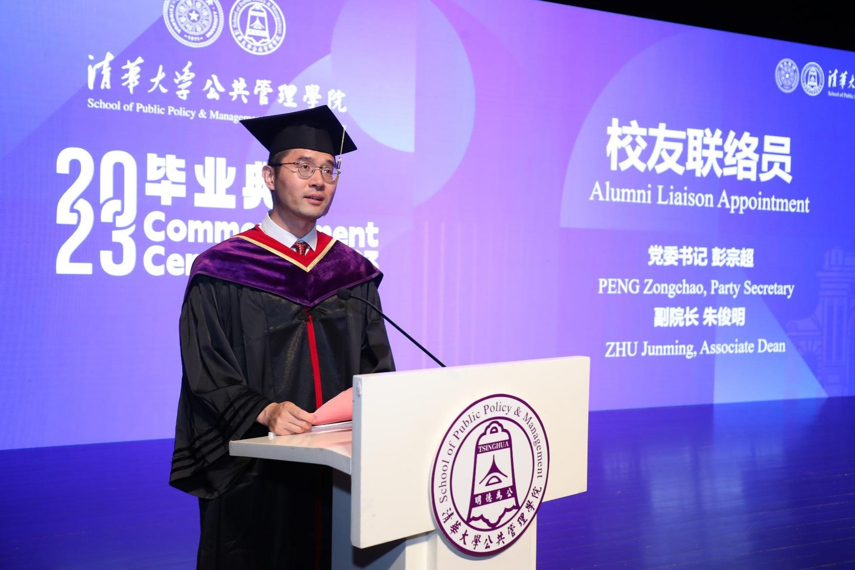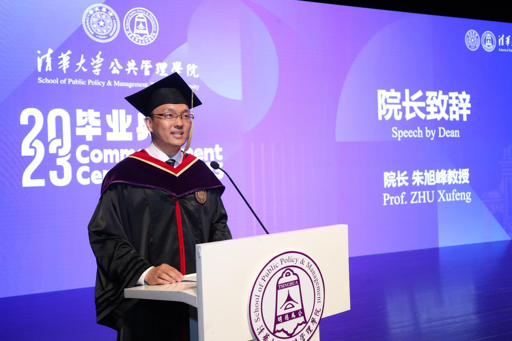 朱旭峰代表学院向各位毕业生表示祝贺,并回忆了同学们求学期间的美好经历和学习收获。他表示,“明德为公”是每个清华公管人所拥有的底色,同学们在未来的人生中应该继续用奋斗绘就属于自己的色彩。同时,他也分享了几点思考和对大家的期待,鼓励大家奋斗的路上要有面对风雨的勇气,要始终拥有胸怀远方的目标,要把热血青春融入祖国山河。