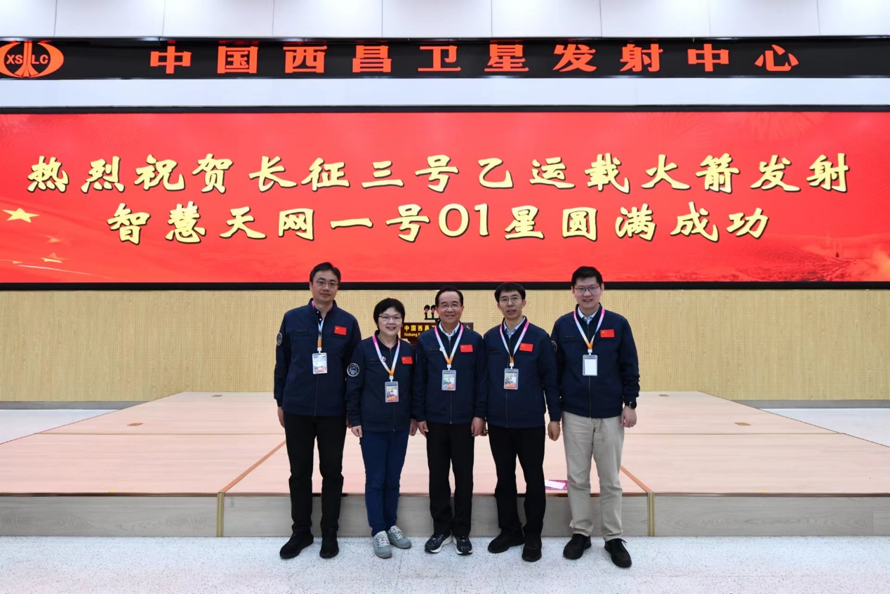 副校长曾嵘(右二)与研制团队主要成员在发射现场合影