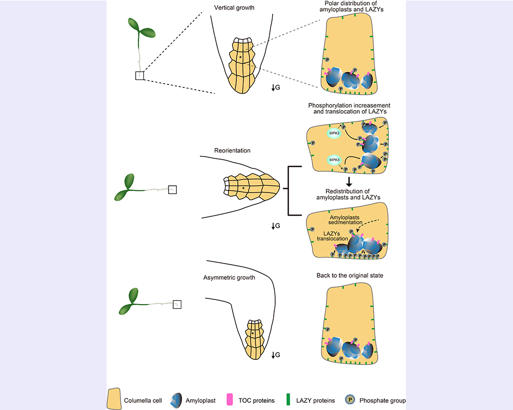 植物根尖向下生长,并不像之前人们想象的因细胞中淀粉体的重量产生了向下拉扯或压力,而是LAZY蛋白结合到淀粉体表面上并随着淀粉体的沉降产生了位移,陈浩东形象地称之为“船载货行”。当植物偏离重力方向时,MKK5-MPK3蛋白激酶模块与LAZY蛋白的相互作用增强,导致LAZY蛋白磷酸化程度增加,LAZY蛋白获得磷酸化这张“船票”后与淀粉体表面的TOC34/120/132蛋白的相互作用增强,并作为“货物”随着“船只”淀粉体沉降到细胞新的底部。此过程中,LAZY蛋白如同乘坐航船在海浪中行进,并在淀粉体沉降到细胞新底部后,逐渐离开“船只”聚集到新的下侧细胞膜上,而后指导了生长素的不对称分布,从而引发植物的向重力性生长反应。当植物根尖重新沿着重力方向竖直向下生长时,LAZY蛋白就会失去“船票”回归到初始状态。