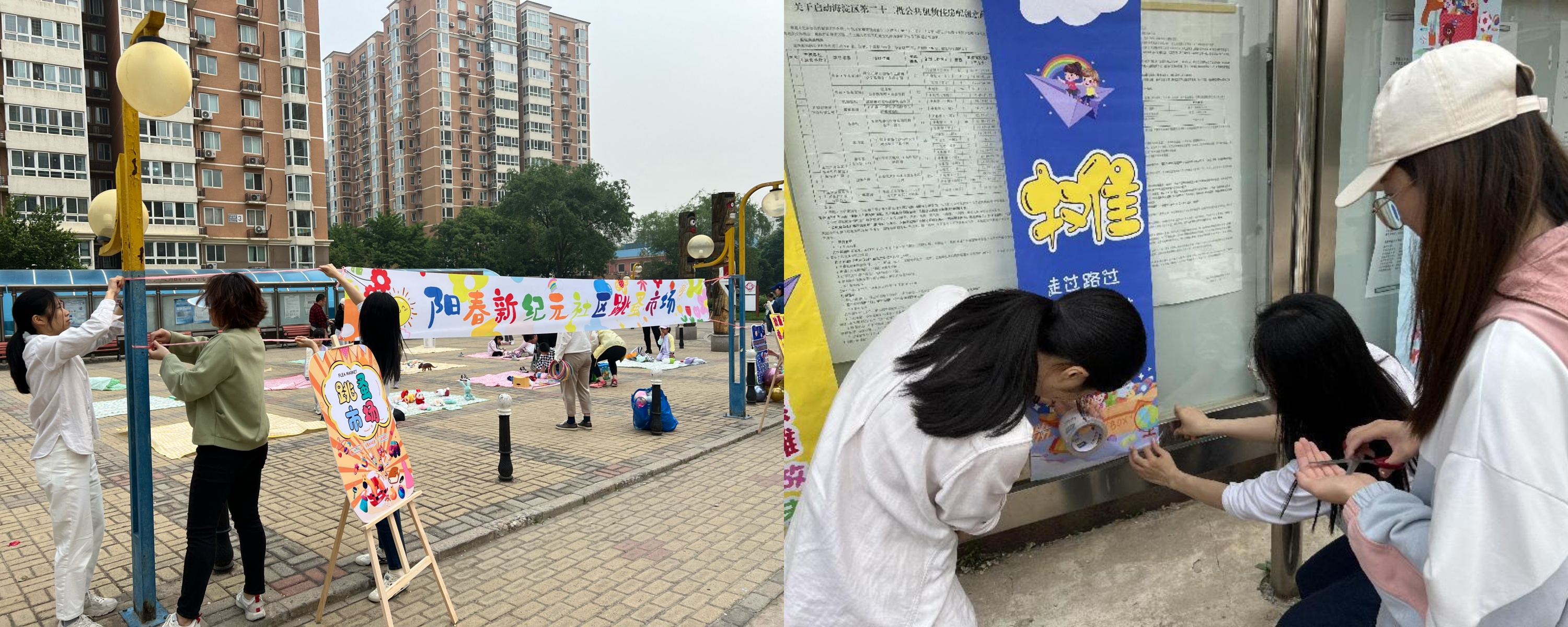 志愿者们组成场地布置与秩序宣导小分队,有条不紊地展开各项工作。吹气球、挂横幅、设摊位、卖吆喝,在志愿者和社区工作人员的通力合作下,小区广场上一个热闹七彩的跳蚤市场便搭建起来,吸引了100多户社区居民参与。