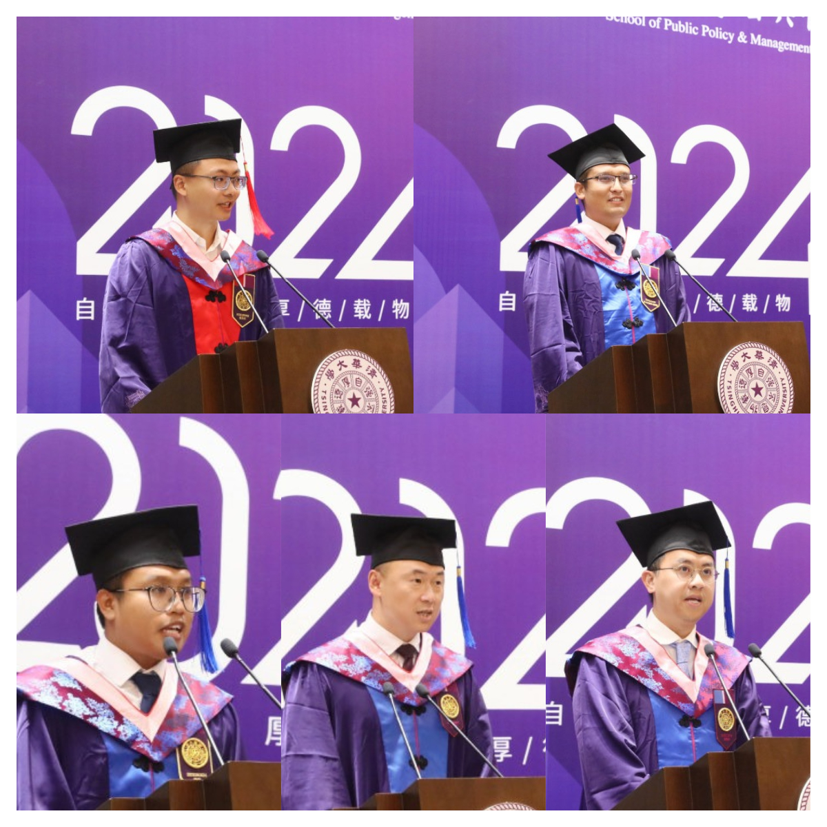 2020级博士毕业生黄培伦、2021级MPA新疆班毕业生阿卜杜克热木·麦麦提、2023级IMPA毕业生瑞安(Rian Setianto)、2021级EMPA毕业生曾仲斌、2019级MPA-EMBA项目毕业生陈晓锋作为毕业生代表分别发言。