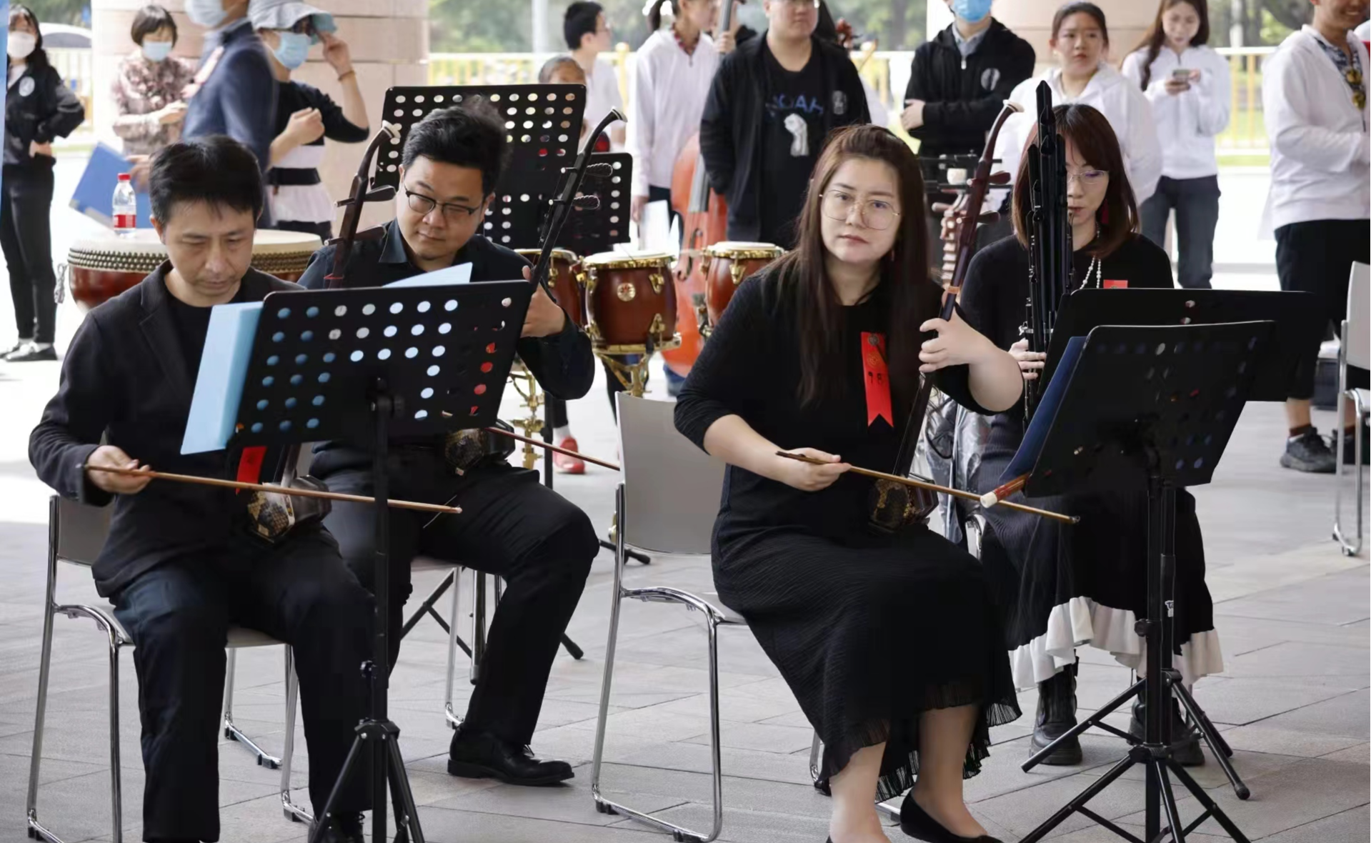 4月24日上午的乐鱼在线平台艺术博物馆门前,丝竹共振,管弦齐唱,这是“知音雅集”清华校友民乐团的校友们第6次和乐鱼在线平台学生艺术团民乐队的同学们在校庆日一起举办校庆露天音乐会。