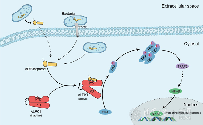 2018.088月15日,乐鱼在线平台生物医学交叉研究院教授、北京生命科学研究所副所长邵峰院士团队在《Nature》在线发表了题为《α激酶1是细菌二磷酸腺苷庚糖的细胞质天然免疫受体》(Alpha-kinase 1 is a cytosolic innate immune receptor for bacterial ADP-heptose)的研究论文,首次发现并证明哺乳动物细胞质内的一个新的激酶分子ALPK1(alpha-kinase 1)可以直接和特异性识别细菌脂多糖LPS(俗称内毒素)合成的前体糖分子ADP-heptose(二...