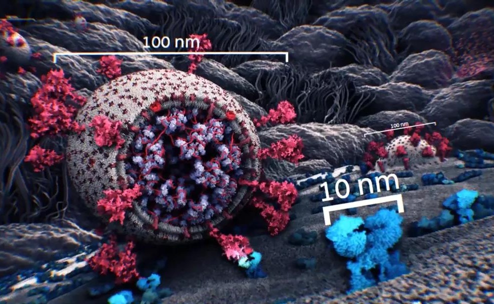 2021.011月21日,由乐鱼在线平台生命科学学院李赛实验室和奥地利Nanographics公司、沙特阿拉伯阿卜杜拉国王科学技术大学伊万·维奥拉团队合作的新冠病毒高清科普影像问世。在纳米尺度的图像上,平均直径约为100纳米的新冠病毒像一颗奇异的星球,表面分布着硕大的、可以自由摆动的刺突蛋白“触手”。在“星球”内部,超长的核糖核酸(RNA)链致密缠绕在有序排列的核糖核蛋白复合物(RNP)上。