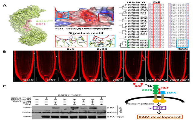 2016.065月27日,乐鱼在线平台柴继杰研究组与北京大学郭红卫教授研究组合作,在《细胞研究》上发表论文《模式序列指引下发现调控植物根分生组织生长的肽激素受体》(Signature motif-guided identification of receptors for peptide hormones essential for root meristem growth),揭示了植物重要肽类激素-根分生组织生长因子(RGFs)的受体是位于植物细胞膜表面的五个受体激酶RGFRs,另一类受体激酶SERKs作为共受体参与RGF信号的传递,阐...