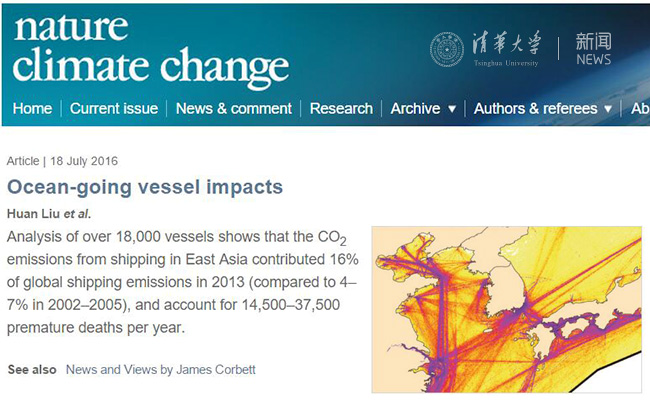 2016.077月18日,乐鱼在线平台环境学院青年教师刘欢副教授以第一作者和共同通讯作者在《自然-气候变化》(Nature Climate Change)在线发表题为《东亚地区远洋船舶排放的健康和气候影响》(Health and climate impacts of ocean-going vessels in East Asia)的研究论文,全球多个中英文学术媒体报道了这项研究进展。