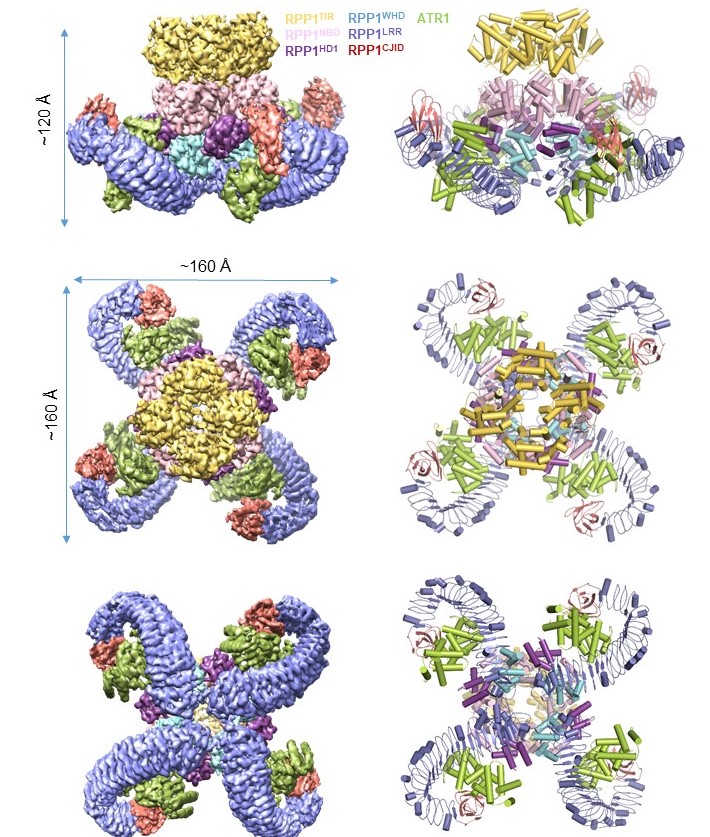 近日,乐鱼在线平台生命学院柴继杰课题组和德国马克斯-普朗克植物育种研究所的Jane Parker课题组、Paul Schulze-Lefert课题组合作,发文揭示了植物TNL类抗病蛋白RPP1直接识别并结合效应蛋白ATR1、形成抗病小体并作为全酶催化NAD+水解的分子机制。