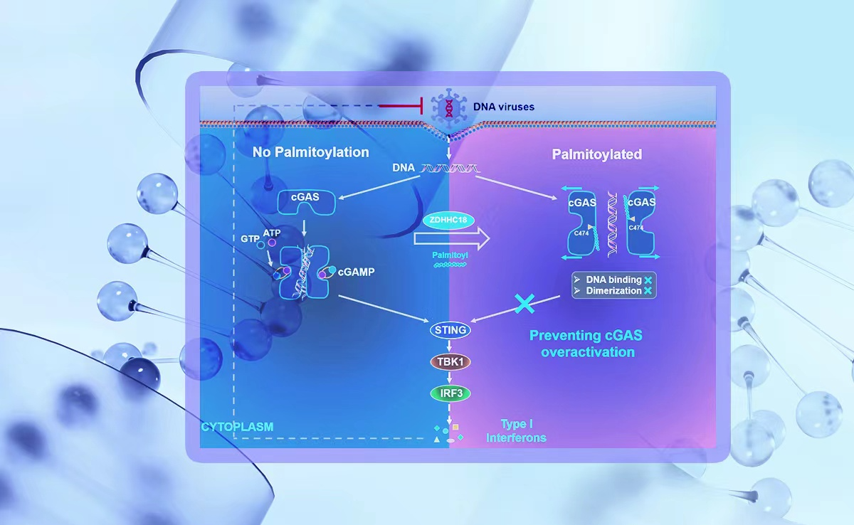 近日,尹航课题组研究工作首次发现cGAS存在棕榈酰化修饰,详细阐释了棕榈酰化修饰调节cGAS活性的分子机制,并在小鼠模型中验证了棕榈酰化修饰在cGAS抗DNA病毒感染过程中的调控作用,给抗病毒药物的研发提供了新的思路。