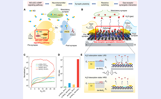 受生物“气体-受体”信号通路的启发,乐鱼在线平台材料学院刘锴副教授团队与谷林教授团队合作,提出了一种气体(H2O)-受体(缺陷)协同作用机制,使MoS2横向忆阻器阻变比提升了超过10000倍。