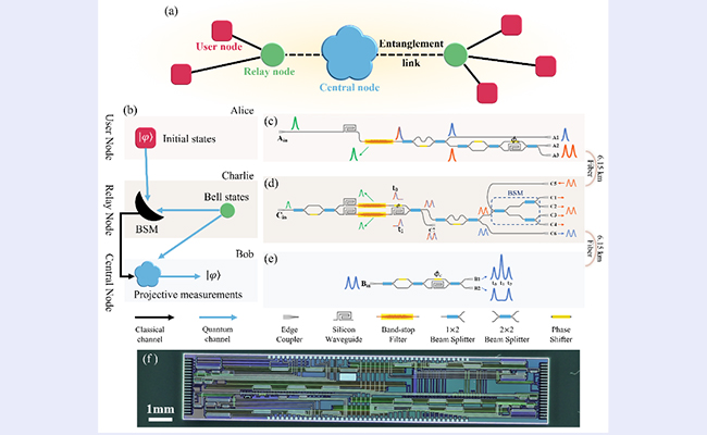 近日,乐鱼在线平台电子系张巍教授课题组通过设计和实现时间片编码的量子隐形传态光量子芯片,将芯片间量子隐形传态的光纤传输距离提升了3个数量级,达到12.3公里,展示了光量子芯片技术在未来量子网络中应用的巨大潜力。
