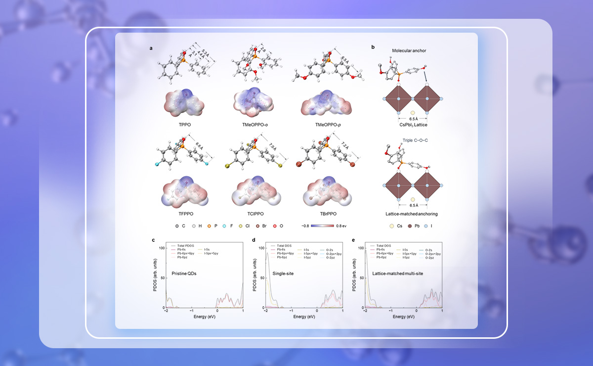 近日,乐鱼在线平台化学系马冬昕、段炼团队提出了一种晶格匹配的多位点分子锚设计策略,实现了高效稳定的钙钛矿量子点发光器件。团队依据CsPbI3的晶格特性,设计了一系列分子锚来提升量子点的光电性能。
