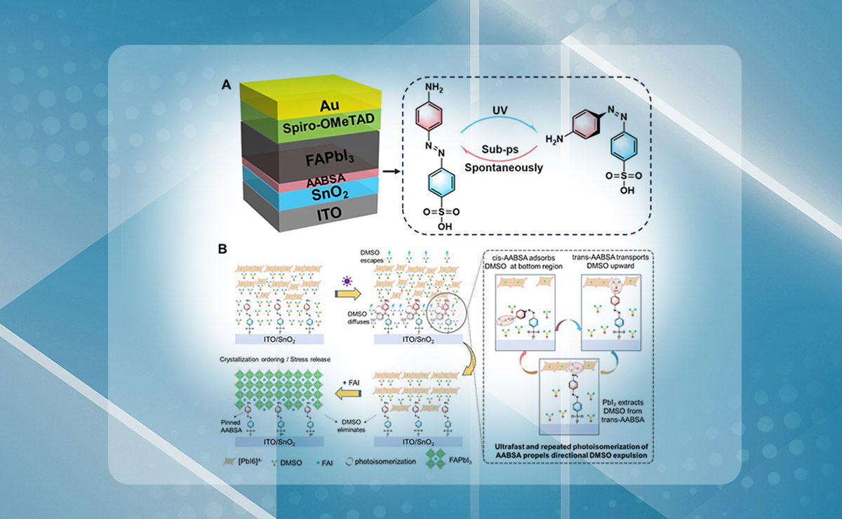 近日,乐鱼在线平台材料学院林红教授团队合作在钙钛矿太阳能电池埋底界面二甲基亚砜(DMSO)残留去除方面取得重要研究进展。该团队创新性地提出了一种光响应分子工程策略,将具有光异构化特性的4'-氨基偶氮苯-4-磺酸(AABSA)分子引入SnO₂/钙钛矿埋底界面。在...