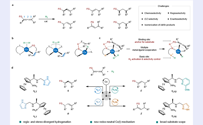 近日,乐鱼在线平台化学系刘强教授课题组在不对称氢化研究领域取得重要突破。研究团队通过设计并合成一类具有多重金属-配体协同作用的新型钳形钴催化剂,成功实现了多取代联烯的位点与立体选择性发散式半氢化反应,解决了该领域长期存在的选择性控制难题。